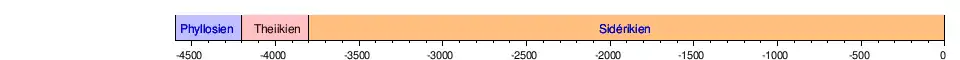 La datation précise de ces éons demeure largement incertaine, et l'analyse détaillée des résultats d'OMEGA suggère en fait une discontinuité entre le Phyllosien et le Theiikien, faisant coïncider le début de ce dernier avec l'Hespérien de la géologie martienne[4] tout en maintenant une durée moindre pour le Phyllosien que pour le Noachien, ce qui conduit du même coup à réajuster l'échelle des temps géologiques martiens :