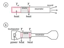 Les machines thermoacoustiques sont constituées dans leurs versions les plus simples d'un résonateur acoustique à l'intérieur duquel est disposée soit une structure poreuse, soit un stack[4], munis d'échangeurs de chaleur à leurs extrémités. C'est la différence de température aux extrémités du stack, entretenue par les deux échangeurs de chaleur, qui donne naissance à l'onde acoustique dans le résonateur. On utilise le plus souvent une source/récepteur d'ondes sonores afin d'assurer une conversion électromécanique de la puissance acoustique entretenue par le résonateur. Moteurs et réfrigérateurs sont parfois directement associés, l'onde acoustique créée par le premier servant à faire fonctionner le second[3].