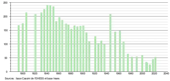 L'évolution du nombre d'habitants est connue à travers les recensements de la population effectués dans la commune depuis 1793. Pour les communes de moins de 10 000 habitants, une enquête de recensement portant sur toute la population est réalisée tous les cinq ans, les populations légales des années intermédiaires étant quant à elles estimées par interpolation ou extrapolation[25]. Pour la commune, le premier recensement exhaustif entrant dans le cadre du nouveau dispositif a été réalisé en 2007[26].