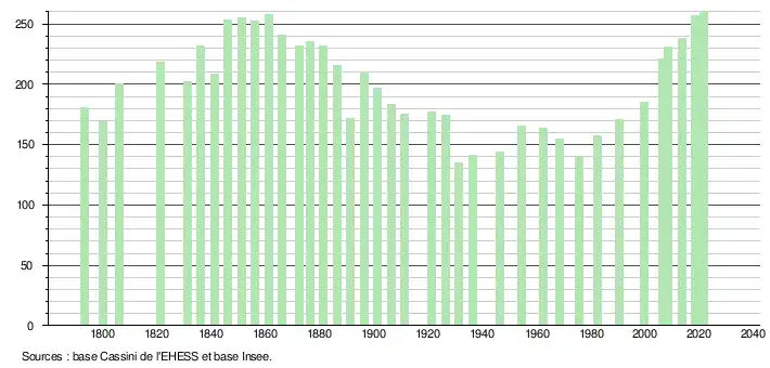 L'évolution du nombre d'habitants est connue à travers les recensements de la population effectués dans la commune depuis 1793. Pour les communes de moins de 10 000 habitants, une enquête de recensement portant sur toute la population est réalisée tous les cinq ans, les populations légales des années intermédiaires étant quant à elles estimées par interpolation ou extrapolation[17]. Pour la commune, le premier recensement exhaustif entrant dans le cadre du nouveau dispositif a été réalisé en 2008[18].