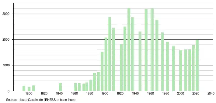 L'évolution du nombre d'habitants est connue à travers les recensements de la population effectués dans la commune depuis 1793. Pour les communes de moins de 10 000 habitants, une enquête de recensement portant sur toute la population est réalisée tous les cinq ans, les populations légales des années intermédiaires étant quant à elles estimées par interpolation ou extrapolation[27]. Pour la commune, le premier recensement exhaustif entrant dans le cadre du nouveau dispositif a été réalisé en 2006[28].