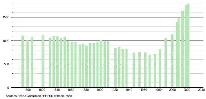L'évolution du nombre d'habitants est connue à travers les recensements de la population effectués dans la commune depuis 1793. Pour les communes de moins de 10 000 habitants, une enquête de recensement portant sur toute la population est réalisée tous les cinq ans, les populations légales des années intermédiaires étant quant à elles estimées par interpolation ou extrapolation[29]. Pour la commune, le premier recensement exhaustif entrant dans le cadre du nouveau dispositif a été réalisé en 2008[30].