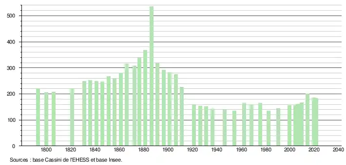 L'évolution du nombre d'habitants est connue à travers les recensements de la population effectués dans la commune depuis 1793. Pour les communes de moins de 10 000 habitants, une enquête de recensement portant sur toute la population est réalisée tous les cinq ans, les populations légales des années intermédiaires étant quant à elles estimées par interpolation ou extrapolation[16]. Pour la commune, le premier recensement exhaustif entrant dans le cadre du nouveau dispositif a été réalisé en 2004[17].