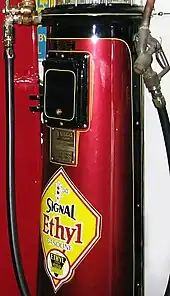Ancienne pompe à essence avec étiquetage signalant la présence de l'additif inventé par Thomas Midgley Jr., fabriqué et distribué par Ethyl Gasoline Corp. (collection privée, origine : Californie).