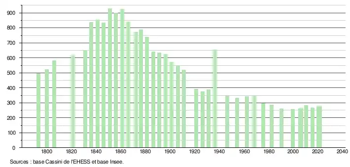 L'évolution du nombre d'habitants est connue à travers les recensements de la population effectués dans la commune depuis 1793. Pour les communes de moins de 10 000 habitants, une enquête de recensement portant sur toute la population est réalisée tous les cinq ans, les populations légales des années intermédiaires étant quant à elles estimées par interpolation ou extrapolation[16]. Pour la commune, le premier recensement exhaustif entrant dans le cadre du nouveau dispositif a été réalisé en 2005[17].
