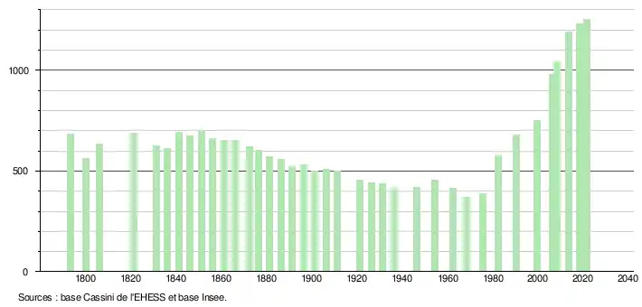 L'évolution du nombre d'habitants est connue à travers les recensements de la population effectués dans la commune depuis 1793. Pour les communes de moins de 10 000 habitants, une enquête de recensement portant sur toute la population est réalisée tous les cinq ans, les populations légales des années intermédiaires étant quant à elles estimées par interpolation ou extrapolation[23]. Pour la commune, le premier recensement exhaustif entrant dans le cadre du nouveau dispositif a été réalisé en 2008[24].
