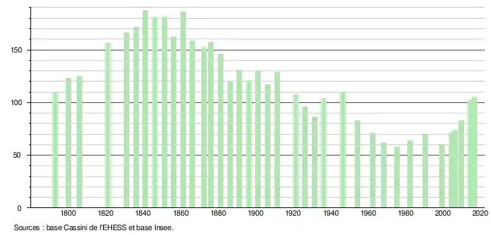 L'évolution du nombre d'habitants est connue à travers les recensements de la population effectués dans la commune depuis 1793. Pour les communes de moins de 10 000 habitants, une enquête de recensement portant sur toute la population est réalisée tous les cinq ans, les populations légales des années intermédiaires étant quant à elles estimées par interpolation ou extrapolation[3]. Pour la commune, le premier recensement exhaustif entrant dans le cadre du nouveau dispositif a été réalisé en 2004[4].