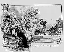 Dessin de Jules-Arsène Garnier qui représente trois juges observant le résultat d'un lancé de dés.