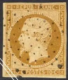 En [5], est émis un timbre non dentelé de 10 centimes de couleur bistre-jaune sur papier blanchâtre et jaunâtre, au type président Louis-Napoléon Bonaparte. Il représente en médaillon le profil gauche de Louis-Napoléon Bonaparte, sacré empereur des Français après le coup d'État du . Il remplace le 10 centimes de même couleur au type Cérès émis en septembre 1850.