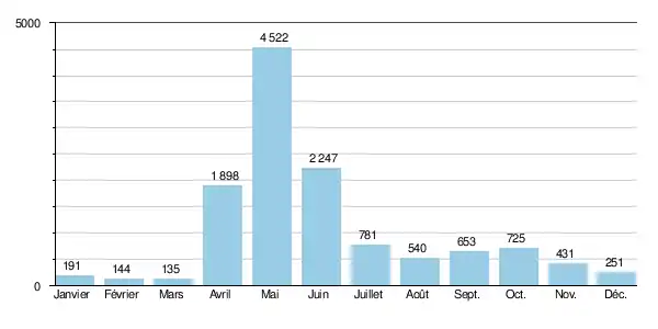 En ce qui concerne la période estivale, la plus importante car libre de glaces (de mai à octobre inclus), le débit minimal observé sur cette même période, a été de 171 m3/s en .