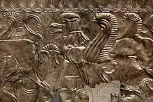 D'autres objets comme des fibules en or, argent et électrum et des disques en terre cuite, images symboliques de boucliers complètent le trousseau.