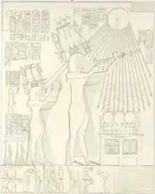 Sur le côté droit, le roi brûle des épices dans une cuillère à tête de faucon, tandis que la reine présente un bouquet de fleurs de lotus. Tous deux portent une couronne Atef élaborée. Akhenaton porte une triple couronne Atef flanquée d'uræi surmontée de faucons portant un disque solaire et accompagnant un double cartouche. Néfertiti porte une double couronne Atef flanquée de deux uræi. Cette couronne est portée sur un modius en forme d'uræus et sur ce qui ressemble à une coiffe khat[2],[9]. Dans le registre situé sous cette scène, on voit la sœur de la reine, Moutbenret (Moutnedjemet), accompagnée de ses deux nains, de deux assistants masculins et de quatre assistantes[2].