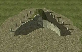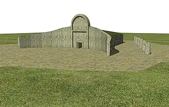 Il est admis que l'architecture des tombes des géants s'est inspirée de celle des constructions mégalithiques funéraires qui les ont précédées, dolmens et allées couvertes. L'entrée est marquée par une façade monumentale faite de grands orthostates plantés en arc de cercle. La dalle centrale est la plus haute (3 à 4 m) et la plus finement ouvragée. Elle s'apparente à une stèle formée d'un seul bloc de pierre ou de deux dalles superposées. La base de cette stèle comporte une petite ouverture, mais c'est une ouverture symbolique, la véritable ouverture se situant latéralement juste derrière la stèle.
