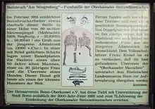 En février 1914, alors qu'ils déblaient des décombres dans la carrière « Am Stingenberg », deux ouvriers découvrent des ossements qu'ils reconnaissent comme des restes humains. Les os et la terre qui les entouraient étaient de couleur rougeâtre, les os en bon état, les deux crânes presque intacts. Les travaux sont alors interrompus et Franz Kissel, professeur à Oberkassel, veille à ce que la découverte soit sécurisée. Sous l’un des crânes est découvert un objet osseux étroit, d’environ 20 cm de long, sculpté à une extrémité. Les restes osseux sont donc déposés dans une vieille caisse à munitions de carriers.