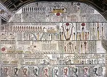 - dans la chambre funéraire, où ne subsiste aujourd'hui qu'un sarcophage brisé, les parois sont ornées du Livre de la terre et de celui du jour et de la nuit. Le plafond astronomique représente Nout sous un double aspect de jour et de nuit, reproduisant ainsi le cycle perpétuel de la renaissance du Soleil.
