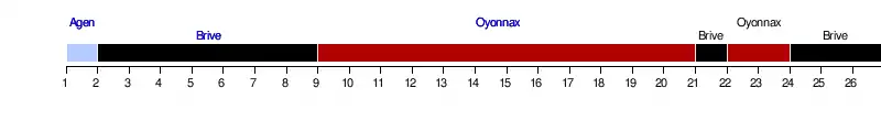| Brive | 12 | 14 | 14 | 14 | 14 | 14 | 14 | 14 | 13 | 13 | 13 | 12 | 13 | 12 | 12 | 12 | 12 | 13 | 13 | 13 | 14 | 13 | 13 | 14 | 14 | 14 |