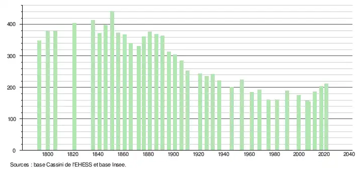 L'évolution du nombre d'habitants est connue à travers les recensements de la population effectués dans la commune depuis 1793. Pour les communes de moins de 10 000 habitants, une enquête de recensement portant sur toute la population est réalisée tous les cinq ans, les populations légales des années intermédiaires étant quant à elles estimées par interpolation ou extrapolation[13]. Pour la commune, le premier recensement exhaustif entrant dans le cadre du nouveau dispositif a été réalisé en 2007[14].