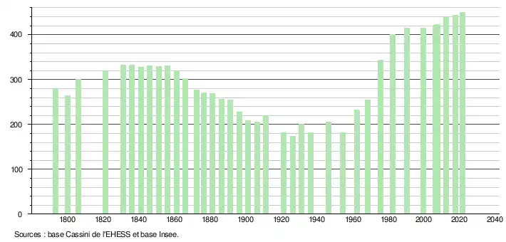 L'évolution du nombre d'habitants est connue à travers les recensements de la population effectués dans la commune depuis 1793. Pour les communes de moins de 10 000 habitants, une enquête de recensement portant sur toute la population est réalisée tous les cinq ans, les populations légales des années intermédiaires étant quant à elles estimées par interpolation ou extrapolation[19]. Pour la commune, le premier recensement exhaustif entrant dans le cadre du nouveau dispositif a été réalisé en 2007[20].