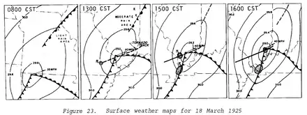 Une dépression s'était formée en surface sur le nord-ouest du Montana vers 7 heures du matin le 16 mars 1925. Elle se déplaça vers le sud-est pour atteindre la région de Denver au Colorado le lendemain[10]. En même temps, un front occlus s'étendait entre la baie d'Hudson et la dépression, alors que de l'air frais et humide donnait du temps brumeux à l'avant du front, du Texas aux Carolines et de l'air sec et instable en allant vers le Nouveau-Mexique. Pendant ce temps, un front chaud le long de la côte du golfe du Mexique pompait de l'air chaud et humide plus au sud. En altitude, une onde courte météorologique avait traversé les montagnes Rocheuses dans la région du Grand Bassin en Utah et développa rapidement le centre de basse pression sur le Colorado[9].