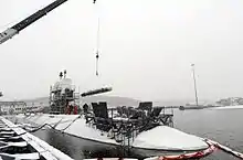 |   Techniciens effectuant de l'entretien en 1982 sur un prototype de torpille Mark 48 ADCAP à Keyport, Washington. | |