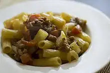 De même, l'accommodement d'une sauce riche («denses et corsées»[20]) peut être à base de hachis de viande ou de poisson: tortiglioni alla napoletana sur la base du ragoût napolitain (chair à saucisse, lard, ail, tomates, raisins)[17] ou au ragout crémé tortiglioni alla crema di ragù [21](viande de veau)[21]. Barilla (1982) indique les tortiglioni comme accompagnement «naturel» de la carbonara (œuf, lard, vin blanc, fromage). On trouve aussi aux sardines, pignons, raisins secs et fromage, aux œufs de saumon et à la vodka, au thon et au maïs[8]. Les tortigioni au fromage chèvre (tortiglioni di caprino) sont cités à Pise[22]. Les tortiglioni se terminent souvent en gratin, au four: pasticci al forno.
