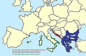 - Testudo hermanni boettgeri Mojsisovics, 1889 Albanie, Bosnie-Herzégovine, Bulgarie, Croatie, Grèce, Macédoine du Nord, Monténégro, Roumanie, Serbie, Thrace en Turquie.