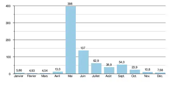 Les hautes eaux se déroulent au printemps, en mai surtout et aussi en juin, ce qui correspond au dégel. De juin à août, le débit baisse fortement, puis un net rebond de moyenne ampleur, a lieu au mois de septembre, lié aux précipitations automnales ainsi qu'à la moindre évaporation en cette saison.