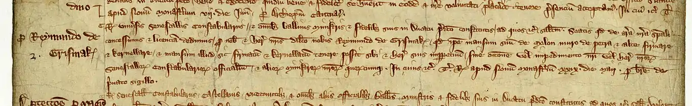 « N° 1242. Pro Reymundo de Grisinak. — Rex universis senescallis, constabulariis et omnibus ballivis, ministris et fidelibus suis in ducatu predicto constitutis, ad quos etc., salutem. Sciatis quod de gracia nostra speciali concessimus et licenciam dedimus pro nobis et heredibus nostris dilecto nobis Reymundo de Grisinak. quod ipse mansum suum de Molon muro de petra et calce firmare et kernellare et mansum illud sic firmatum et kernellatum tenere possit sibi et heredibus suis imperpetuum sine occasione vel impedimento nostri vel heredum nostrorum, senescallorum, constabulariorum, officialium et aliorum ministrorumnostrorum In quorumcumque. cujus etc. T. R. apud Novum Monasterium, xxix die Maii. Per breve de privato sigillo. »