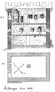 - Le plancher du second étage était établi comme celui du premier. Le pilier ne s'élève pas au-dessus du sol du second étage ; mais comme il était en même temps destiné à soutenir la charpente, il devait être surmonté d'un poteau en bois.