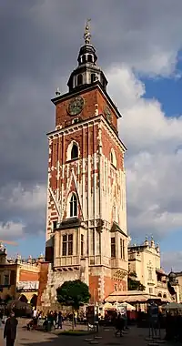 Construite en pierre et en brique à la fin du XIVe siècle, la Tour de l'Hôtel de Ville mesure 70 mètres de hauteur et penche de 55 centimètres, à la suite d'une tempête ayant touché Cracovie en 1703. L'étroit escalier de la Tour, ouvert aux visiteurs, mène au mécanisme de l'horloge d'où l'on peut admirer une vue sur la ville, par les ouvertures percées au niveau de la coupole baroque, venue en 1686 remplacer la flèche gothique qui a été brûlé par la foudre en 1680[1]. Le toit baroque construit alors par l'architecte royal Piotr Beber ne survécut que jusqu'en 1783 et fut remplacé par une structure plus modeste offerte à la ville par l'archevêque Kajetan Sołtyk.