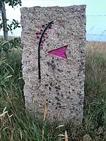 - Le « sentier des Bruyères », promenade de neuf kilomètres, d’une durée de quatre heures environ, traversant par deux fois la Vézère naissante sur deux petits ponts de bois et disposé de neuf stations d’interprétation. Le balisage est assuré par de gros blocs de pierre où se trouvent gravées une fleur de bruyère et une flèche de direction mauve. Pour être notoirement plus important, le dénivelé de ce circuit rend le trajet moins accessible que le précédent. Balisage du Sentier des Bruyères. Balisage du Sentier des Bruyères.