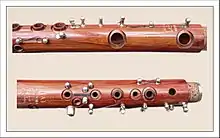 - des vis (3) maintenant les clefs en bout d'axe, également vissées sur des tourillons. Il s'agit de « clefs à tringle » dont l'axe est plein et percée à chaque extrémité pour recevoir les pointes de vis[4]. Cette solution offre une grande réduction des frottements donc une plus grande vélocité à l'instrument. Elle est surtout moins encombrante, mais ne permet pas l'alignement de plusieurs clés. Seulement là aussi, pour les pièces de grande longueur la maîtrise du jeu mécanique est délicate.