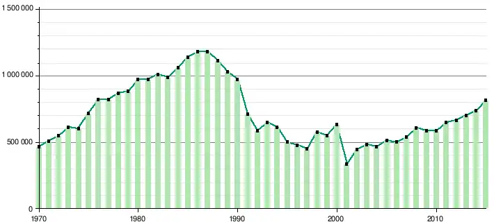 Nombre d'arrivées de touristes de 1970 à 2015[3] :