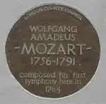 Le premier logement de la famille Mozart à Londres fut au-dessus d'un barbier dans Cecil Court, près de l'église de St Martin-in-the-Fields. Des lettres de recommandation en provenance de Paris se révélèrent efficaces. Le , les enfants jouèrent devant le roi George III du Royaume-Uni et sa reine Charlotte de Mecklembourg-Strelitz[36]. Un deuxième engagement royal fut fixé pour le [Note 4], où Wolfgang fut invité par le roi à jouer des œuvres de Georg Friedrich Haendel, Johann Christian Bach et Karl Friedrich Abel. Le roi fut impressionné par son jeu d'orgue, plus encore que par son jeu de clavecin. Wolfgang fut autorisé à accompagner la reine qui chantait une aria, puis fit une basse continue à partir d'une aria de Haendel et, selon Leopold, « improvisa la plus belle mélodie de manière telle que tout le monde fut étonné »[36],[37].