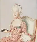 Nannerl elle-même fut une élève très douée, pas moins rapide à apprendre que son frère, jouant du clavier avec une virtuosité remarquable pour ses onze ans[9]. Au cours de cette année 1762, Leopold emmena les enfants jouer à Munich devant Maximilien III Joseph, Duc et Électeur de Bavière[Note 2]. Leopold ensuite emmena toute la famille à Vienne pour un voyage qui dura trois mois[10]. Il obtint des invitations de plusieurs mécènes nobles et dans les trois jours de l'arrivée, les enfants jouèrent au palais du comte Collalto (de). Parmi les présents, étaient le conseiller de la trésorerie de Vienne et le futur premier ministre, le comte Johann Karl Zinzendorf, qui nota dans son journal intime qu'« un petit garçon, dont on disait qu'il n'avait que cinq ans et demi (Wolfgang avait en fait près de sept ans) jouait du clavecin »[10]. Après une audition devant le vice-chancelier impérial, les Mozart furent invités à la cour royale, où l'impératrice Marie-Thérèse testa les capacités de Wolfgang en lui demandant de jouer avec le clavier couvert par un tissu[10]. Au cours de cette visite, Wolfgang rencontra l'Archiduchesse Maria Antonia, la future reine de France, qui était de deux mois son aînée. Le biographe de Mozart Eric Blom raconte une anecdote sur la manière dont l'Archiduchesse aida Wolfgang quand il glissa sur le sol poli, et qu'elle aurait alors reçu une proposition de mariage en échange[11],[12].