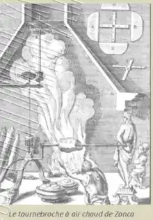 Le savant turc, Taqi al-Din, décrit en 1551 un exemple de tournebroche à vapeur dans son ouvrage, Al-Turuq al-samiyya fi al-alat al-ruhaniyya. Il existe au musée de Valenciennes un dessin de Léonard de Vinci qui représente un tournebroche mû par la vapeur (plus précisément de l'air raréfié)[6].