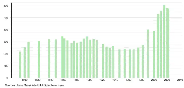 L'évolution du nombre d'habitants est connue à travers les recensements de la population effectués dans la commune depuis 1793. Pour les communes de moins de 10 000 habitants, une enquête de recensement portant sur toute la population est réalisée tous les cinq ans, les populations légales des années intermédiaires étant quant à elles estimées par interpolation ou extrapolation[14]. Pour la commune, le premier recensement exhaustif entrant dans le cadre du nouveau dispositif a été réalisé en 2005[15].