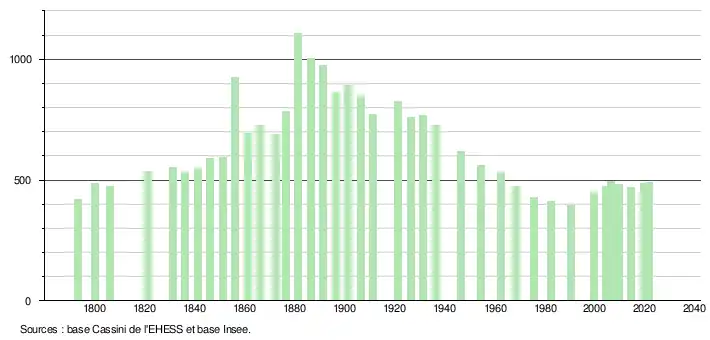 L'évolution du nombre d'habitants est connue à travers les recensements de la population effectués dans la commune depuis 1793. Pour les communes de moins de 10 000 habitants, une enquête de recensement portant sur toute la population est réalisée tous les cinq ans, les populations légales des années intermédiaires étant quant à elles estimées par interpolation ou extrapolation[22]. Pour la commune, le premier recensement exhaustif entrant dans le cadre du nouveau dispositif a été réalisé en 2004[23].