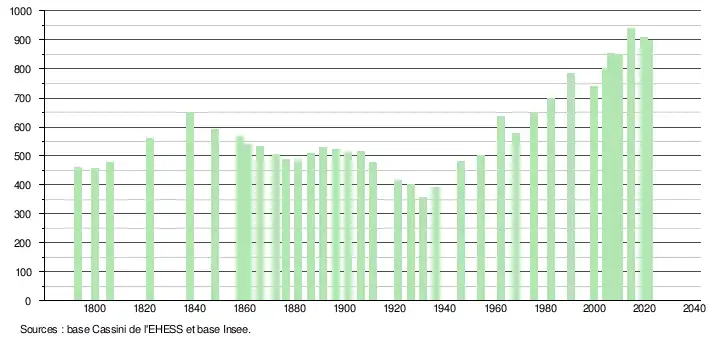 L'évolution du nombre d'habitants est connue à travers les recensements de la population effectués dans la commune depuis 1793. Pour les communes de moins de 10 000 habitants, une enquête de recensement portant sur toute la population est réalisée tous les cinq ans, les populations légales des années intermédiaires étant quant à elles estimées par interpolation ou extrapolation[12]. Pour la commune, le premier recensement exhaustif entrant dans le cadre du nouveau dispositif a été réalisé en 2004[13].