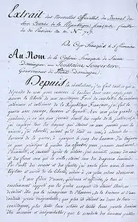 Toussaint s’émancipe rapidement de la tutelle des deux chefs historiques du mouvement ainsi que de celle des Espagnols, en entretenant des relations avec le camp français[13]. Le , il rallie ainsi le camp républicain sur l’offre du du gouverneur général Lavaux. Longtemps, les historiens ont cru que cette décision avait été motivée par l’officialisation de l’abolition de l’esclavage par la Convention le 4 février 1794. L’historien américain John Garrigus a démontré que ce n'était pas le cas : la mesure de la Convention n’avait pas encore été portée à l’île.