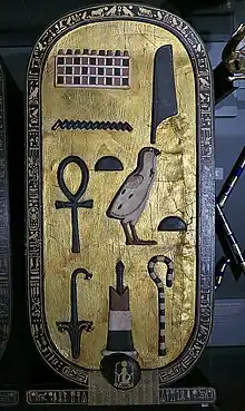 Chaque pharaon avait plusieurs noms, de famille, d'enfance, religieux, de couronnement. Le cas de Toutânkhamon est complexe, puisque sous le règne d'Akhenaton il a été d'abord Toutânkhaton avant le rétablissement du culte d'Amon. Les cartouches les plus fréquemment représentés sur les objets lui ayant appartenu sont le 4e nom : titre de fils de Rê : T-ou-t-ankh-Imen heqa-Iunu-shema (l'image vivante d'Amon, seigneur de l'Héliopolis de Haute-Égypte) et le 5e nom, le plus connu visuellement : le titre de roi de Haute et Basse-Égypte : Neb-Kheperou-Rê (Rê est le maître des transformations)[14].
