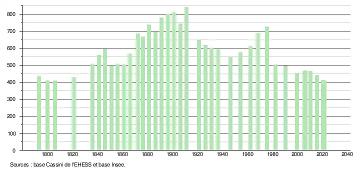 L'évolution du nombre d'habitants est connue à travers les recensements de la population effectués dans la commune depuis 1793. Pour les communes de moins de 10 000 habitants, une enquête de recensement portant sur toute la population est réalisée tous les cinq ans, les populations légales des années intermédiaires étant quant à elles estimées par interpolation ou extrapolation[13]. Pour la commune, le premier recensement exhaustif entrant dans le cadre du nouveau dispositif a été réalisé en 2005[14].