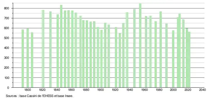 L'évolution du nombre d'habitants est connue à travers les recensements de la population effectués dans la commune depuis 1793. Pour les communes de moins de 10 000 habitants, une enquête de recensement portant sur toute la population est réalisée tous les cinq ans, les populations légales des années intermédiaires étant quant à elles estimées par interpolation ou extrapolation[38]. Pour la commune, le premier recensement exhaustif entrant dans le cadre du nouveau dispositif a été réalisé en 2008[39].