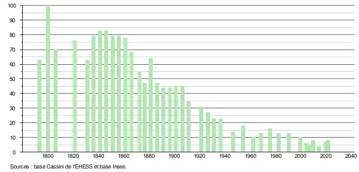 L'évolution du nombre d'habitants est connue à travers les recensements de la population effectués dans la commune depuis 1793. Pour les communes de moins de 10 000 habitants, une enquête de recensement portant sur toute la population est réalisée tous les cinq ans, les populations légales des années intermédiaires étant quant à elles estimées par interpolation ou extrapolation[33]. Pour la commune, le premier recensement exhaustif entrant dans le cadre du nouveau dispositif a été réalisé en 2004[34].