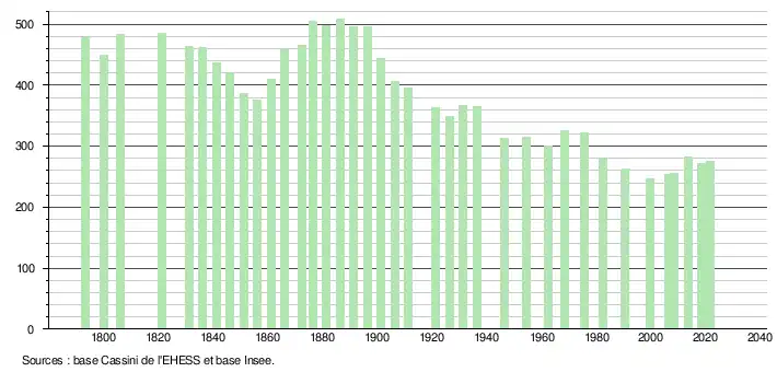 L'évolution du nombre d'habitants est connue à travers les recensements de la population effectués dans la commune depuis 1793. Pour les communes de moins de 10 000 habitants, une enquête de recensement portant sur toute la population est réalisée tous les cinq ans, les populations légales des années intermédiaires étant quant à elles estimées par interpolation ou extrapolation[19]. Pour la commune, le premier recensement exhaustif entrant dans le cadre du nouveau dispositif a été réalisé en 2008[20].