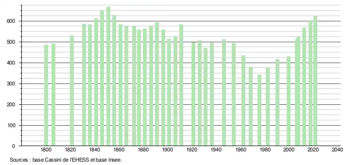 L'évolution du nombre d'habitants est connue à travers les recensements de la population effectués dans la commune depuis 1800. Pour les communes de moins de 10 000 habitants, une enquête de recensement portant sur toute la population est réalisée tous les cinq ans, les populations légales des années intermédiaires étant quant à elles estimées par interpolation ou extrapolation[30]. Pour la commune, le premier recensement exhaustif entrant dans le cadre du nouveau dispositif a été réalisé en 2007[31].