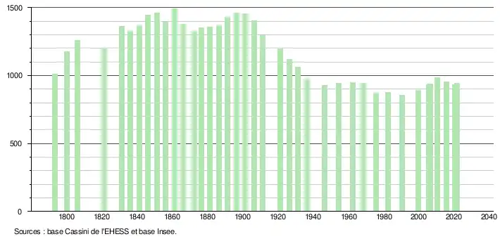 L'évolution du nombre d'habitants est connue à travers les recensements de la population effectués dans la commune depuis 1793. Pour les communes de moins de 10 000 habitants, une enquête de recensement portant sur toute la population est réalisée tous les cinq ans, les populations légales des années intermédiaires étant quant à elles estimées par interpolation ou extrapolation[30]. Pour la commune, le premier recensement exhaustif entrant dans le cadre du nouveau dispositif a été réalisé en 2005[31].