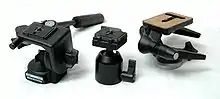 - Les têtes à rotule construites autour d'une boule montée dans un creux, ce qui permet des mouvements dans les deux dimensions. Le boîtier est fixé à une tige qui sort de la boule, et qui porte une articulation pour basculer le boîtier entre les orientations portrait ou paysage.
