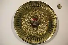 « Le centre de la patène est occupé par un petit émail circulaire, peint sur argent avec des couleurs translucides par parties[D 1] » qui représente l'adoration des bergers[Auzas 10]. Cette scène est une reprise d'une nativité de Albrecht Dürer, effectuée vers 1503[OBB 2].