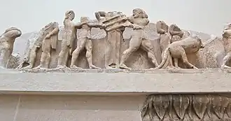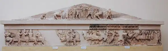 Le côté oriental représente une assemblée des douze Olympiens assis. Au centre (perdu) de l'assemblée, Hermès, tenant la balance remplie des âmes d'Achille et de Memnon, était représenté pesant les âmes (psychostasie). À gauche sont assis les dieux protecteurs de Memnon et des Troyens : Apollon, Arès, Aphrodite et Artémis. Au milieu est assis Zeus sur son trône. Sur l'autre moitié de cette frise, on distingue Achille et Memnon se disputant le corps d'Antiloque mort. La face ouest peut montrer l'histoire du jugement de Pâris, la mort d'Orion ou plutôt Athéna traduisant Héraklès sur l'Olympe[10]. Le côté nord affiche la Gigantomachie. La frise sud est la plus usée ; on discerne nettement les traces de chevaux magnifiquement sculptés : il a été suggéré que la scène représente l'enlèvement d'Hippodamie par Pélops ou des Leucippides par les Dioscures ou l'enlèvement de Perséphone par Hadès. Les reliefs ont été peints avec des nuances vives de vert, de bleu, de rouge et d'or, créant ainsi un code unique de polychromie.